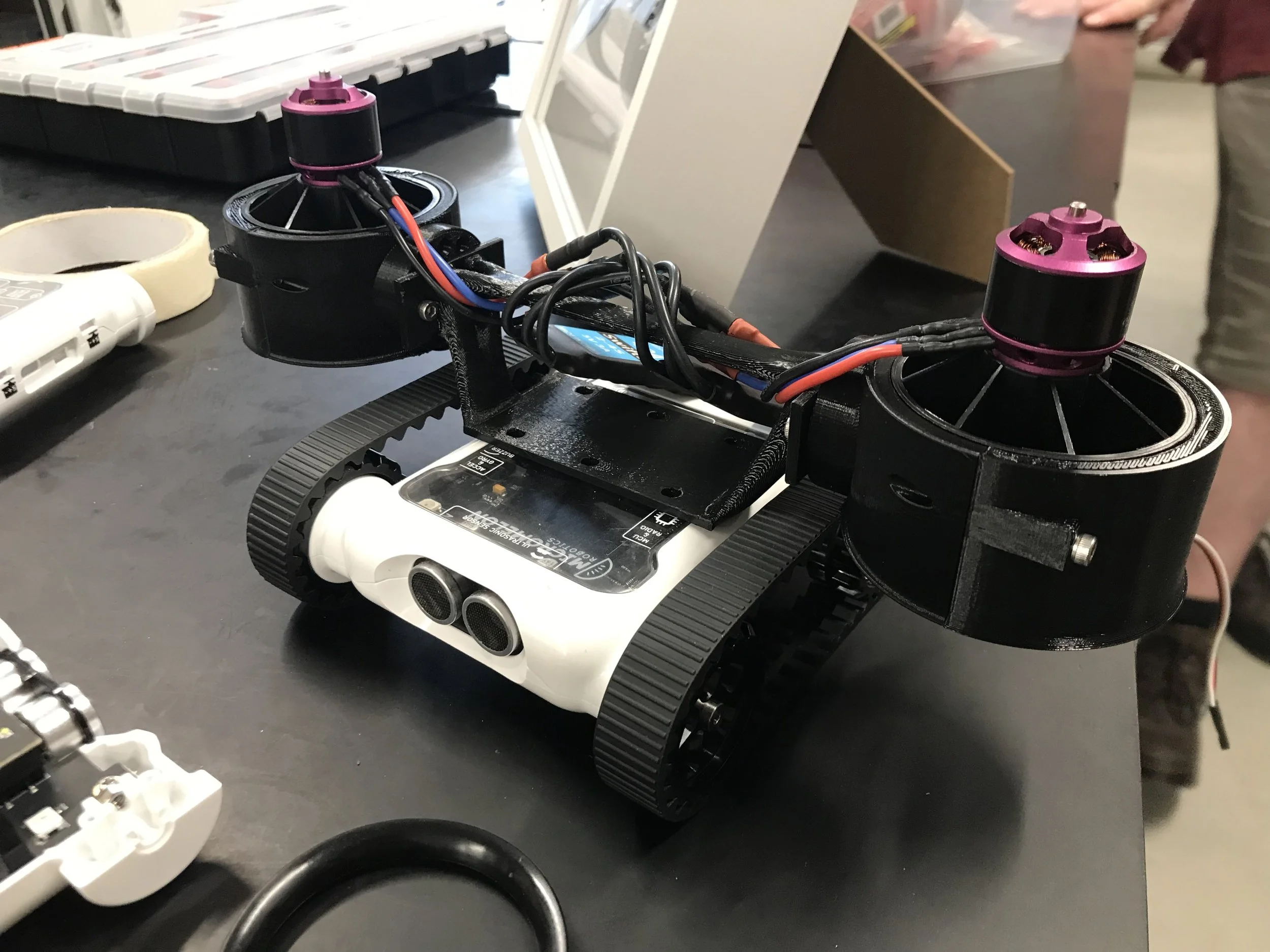 Prototype 1 has been labelled the ‘Spicy Sombrero’. The basic idea for this one is to use drone motors and propellors to create a thrust to push the robot down. Theoretically, when the robot starts climbing the wall, it will not fall backwards as the fan will push it into the wall. By increasing the normal force acting on the rover from the ramp, we hope to increase the friction force to give it better traction.