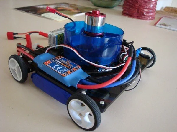 For this design, the standard quadcopter propellor was replaced with 2 EDFs. These are much larger fans that are capable of producing far more thrust, however they are much heavier and consume a lot more power. Due to this, each EDF was powered with its own battery which adds even more weight. To balance the force of the 2 fans, they were attached on either side of the rover. Another benefit of this placement is that the fans can not only create downwards thrust, but they can also make a suction effect to the ground, which will properly sick the rover to the ground.